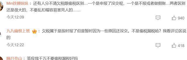 “一个是申报了没交呢,一个是不报或者做假账,两者区别还是很大的,不要乱扣帽容易害死人的。” “欠税属于是按时报了但是暂时因为一些原因还没交。不是偷税漏税哈!” “写完作业忘交了而已,这事儿也揪出来上热搜,无聊。”